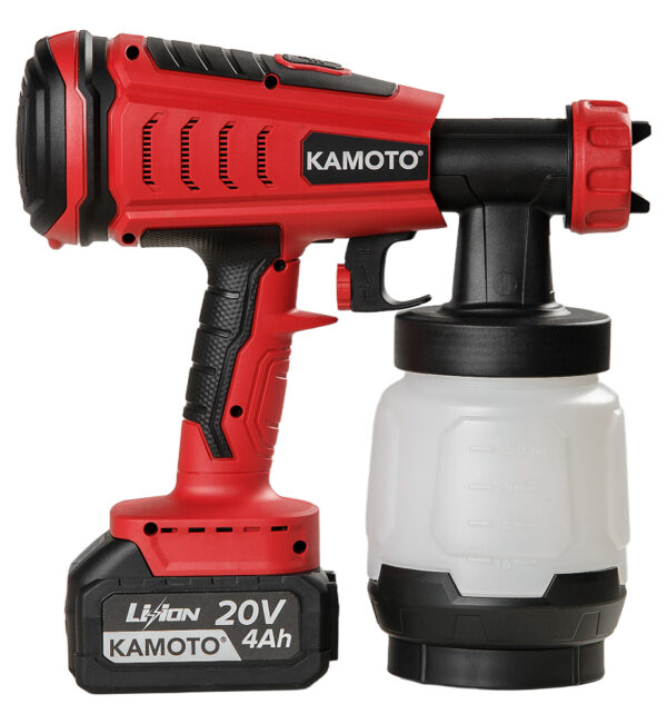 Pulverizatorul electric de vopsea KAMOTO SG950 este proiectat pentru lucrări de volum mare, modelul fiind caracterizat prin rentabilitate, transfer eficient de vopsea și calitate ridicată a suprafeței vopsite. Compresorul poate fi așezat pe podea sau agățat pe umăr de cureaua inclusă, lăsând doar atomizorul și rezervorul de vopsea în mâna meșterului, care este mult mai ușor decât modelul combinat și permite meșterului să lucreze pentru perioade mai lungi de timp.