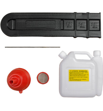 В комплекте поставки: емкость для смешивания топливной смеси, напильник для заточки цепи и необходимый для обслуживания набор инструмента.