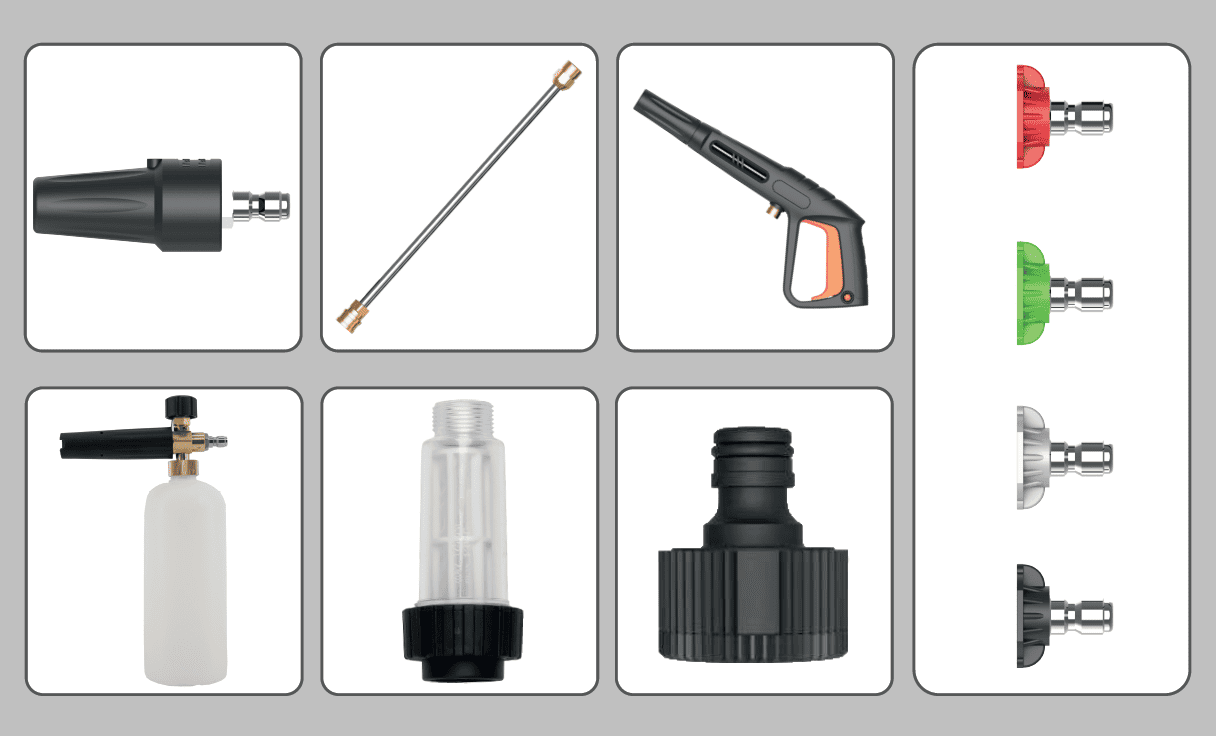 Комплектация: пласт. пистолет и удлинительная насадка, насадка веерная, шланг высокого давления 8 м, встроенный бак для моющего раствора, пеногенератор, фильтр грубой очистки